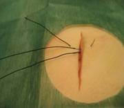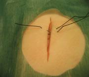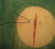 Resultado final: Bordes evertidos, hilos paralelos a la incisión y nudos (como en todas las técnicas de punto discontinuo) a un lado de la herida.