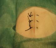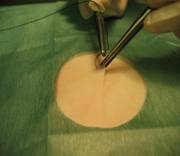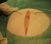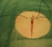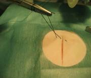 Resultado final: Bordes evertidos, hilos perpendiculares a la incisión, con el doble trayecto y nudos a un lado de la misma.