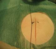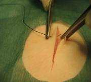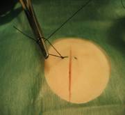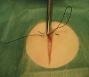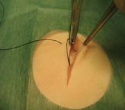La aguja vuelve a entrar en el borde de la herida, por delante del punto anterior, por lo que debemos tener la precaución de dejar el suficiente espacio de los bordes (7-8 mm). Y sale por el mismo borde de la herida mas superficialmente que el 1º, por lo que el hilo quedará paralelo entre si.