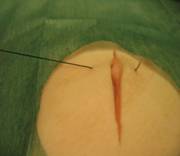 La aguja entra en el borde contrario, también al nivel del plano subcutáneo.