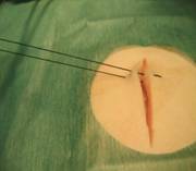 Visión del recorrido del hilo antes de ser anudado. Es una “ida y vuelta”, quedando paralelos verticalmente, y que unirá tejido epidérmico, dérmico y subcutáneo.