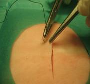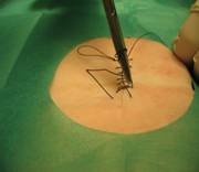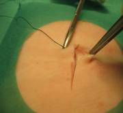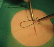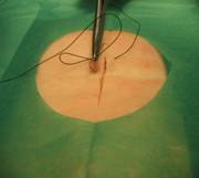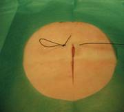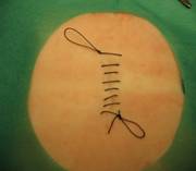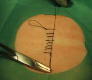Visión del recorrido del hilo: La parte externa perpendicular a la herida y la subcutánea con leve inclinación. Una vez que hemos tensado el hilo, podemos observar la perfecta aproximación de los bordes.