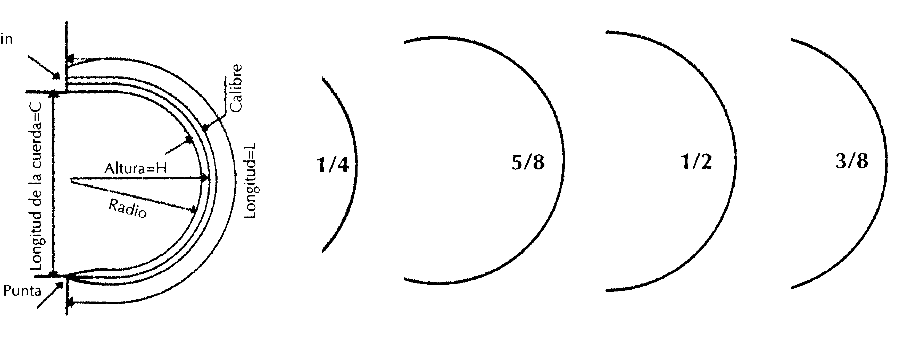 Curvas: Su curvatura varía. Se nombran en función de la curvatura del cuerpo de la aguja respecto a la circunferencia, y en función al ángulo que necesitemos y el espacio de maniobra que tengamos, elegiremos unas y otras: ¼ de círculo para ojos y microcirugía. 3/8 de círculo para músculo, nervios, vasos, cavidad nasal, oral, faringe y piel, y 5/8 de círculo para cavidad nasal y oral.